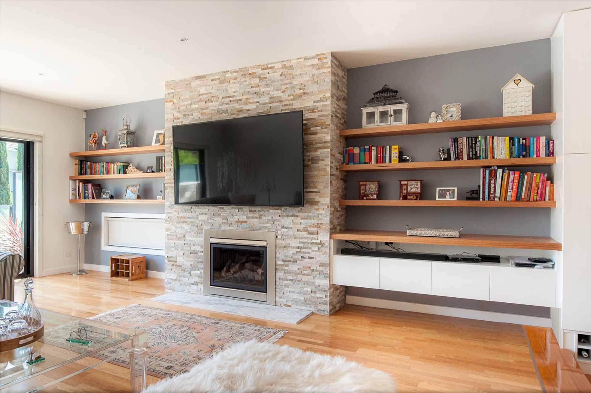 There are a variety of options to choose from when selecting what to put around your fireplace. Elevating your fireplace with bespoke shelving and storage allows you to have a space that seamlessly blends style and functionality. Opting for bookshelving provides a dedicated space for your favourite books and creates an inviting atmosphere for relaxation. A custom TV unit integrates a space for components and helps manage stcables.